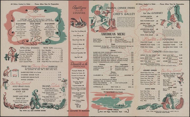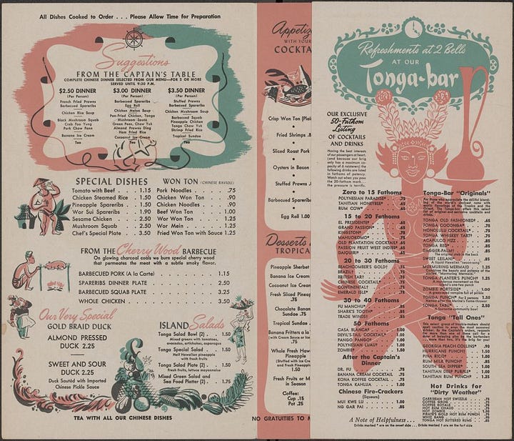 This influence extended to the food menu. Asian cuisine (especially Chinese food) became the food of choice at tiki bars because it was considered “exotic but familiar” enough to the American palate, compared to actual Polynesian food.
